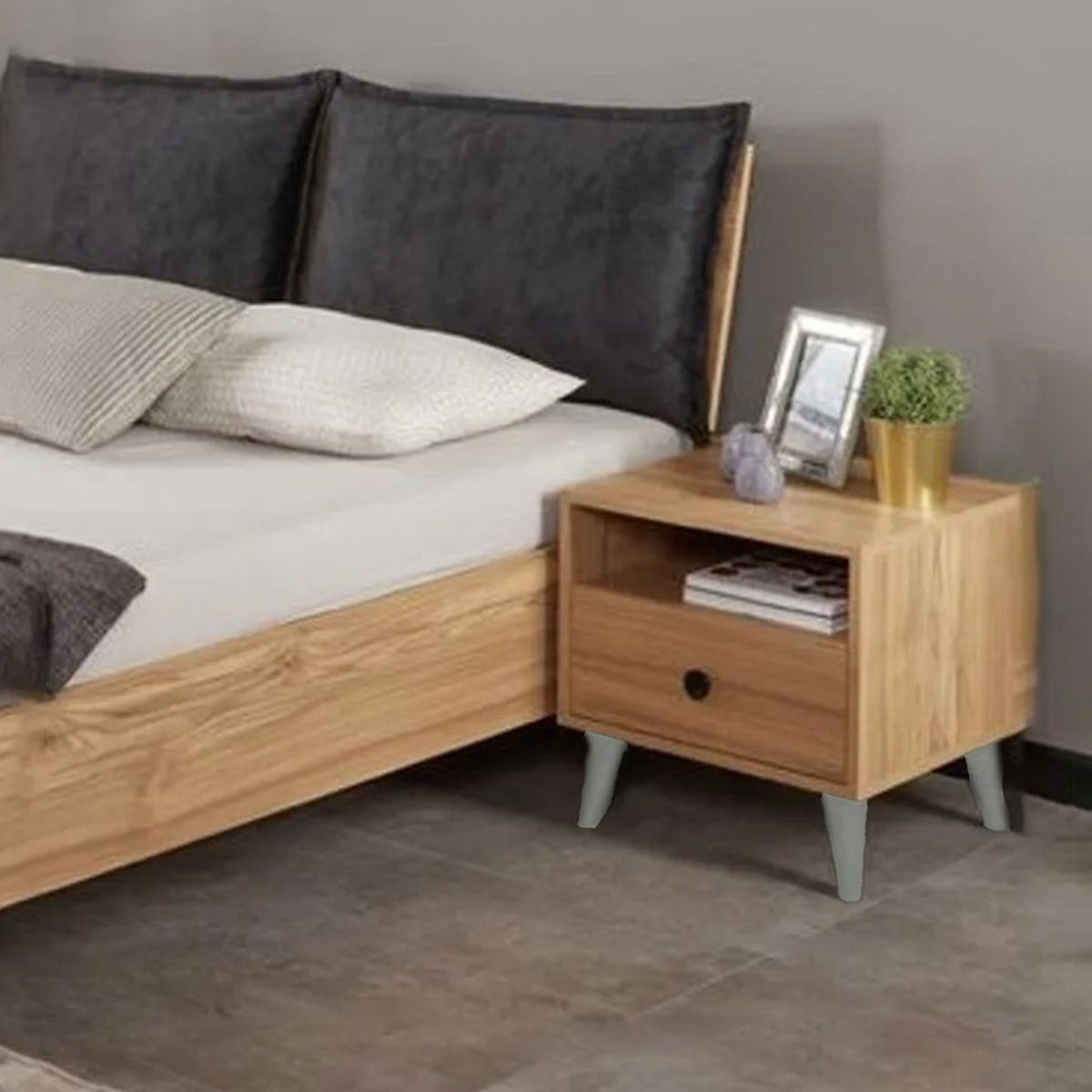 Cette table de nuit s’intègre parfaitement dans toutes les chambres à coucher au style moderne. Son fini aspect chêne lui confère une touche d’élégance naturelle.
